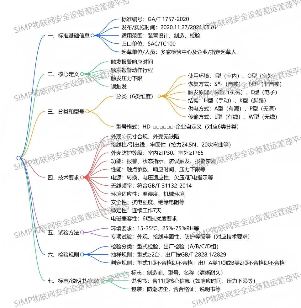 GA/T 1757-2020《入侵和紧急报警系统 紧急报警装置》于2020年11月27日发布、2021年5月1日实施,适用于该类装置的设计、制造和检验,明确了装置按使用环境、恢复方式等6类分类维度及规范型号格式,规定了外观、接线牢固性、外壳防护等级(室内≥IP30、室外≥IP65)、功能(报警、状态指示等)、性能(触发报警响应时间≤400ms等)、电源、环境适应性等核心技术要求,配套了对应的试验方法,划分了型式检验和出厂检验(含A/B/C/D四组)的检验规则,同时明确了标志、说明书、包装的具体要求。